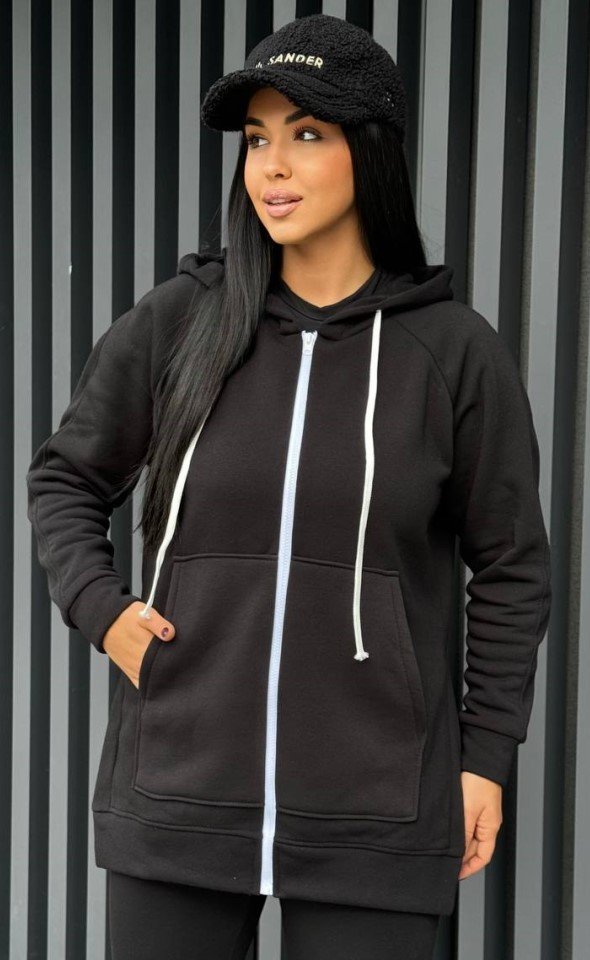 Костюм чудово підходить для повсякденного використання. Еластичні манжети на штанинах забезпечують зручну посадку, а капюшон прикрашений наліпкою зі стразами для стильного акценту. На нижній частині штанів розташовані наліпки меншого розміру, додаючи витонченого завершення образу.