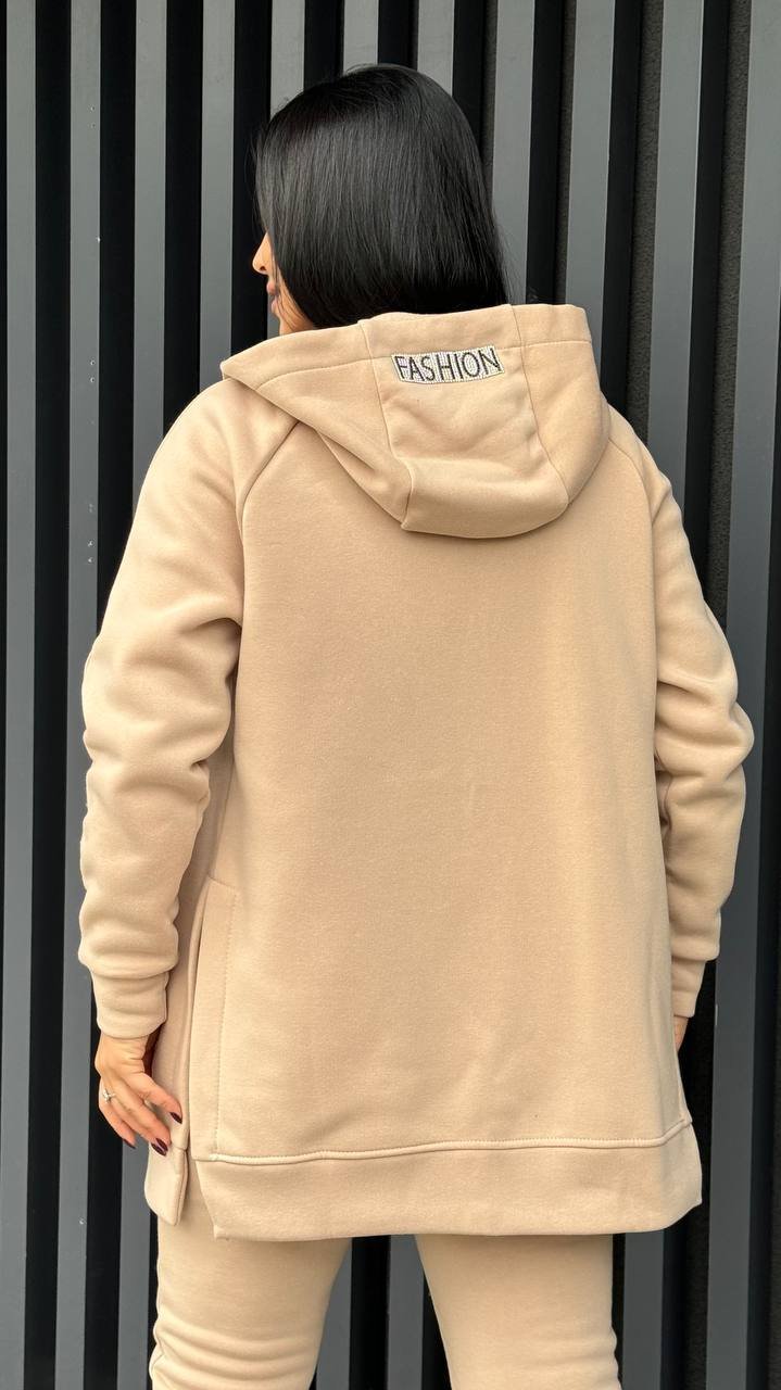 Костюм чудово підходить для повсякденного використання. Еластичні манжети на штанинах забезпечують зручну посадку, а капюшон прикрашений наліпкою зі стразами для стильного акценту. На нижній частині штанів розташовані наліпки меншого розміру, додаючи витонченого завершення образу.